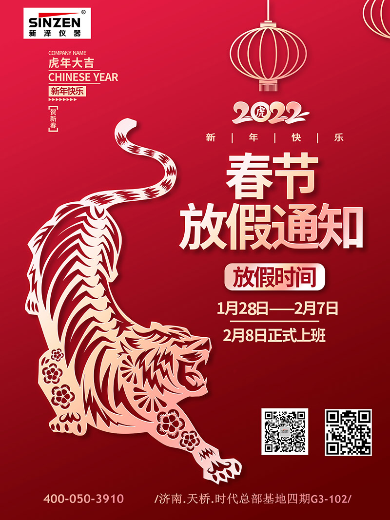 我公司將在2022年1月28日至2月7日放假,2月8號正式上班,在此期間如有問題可咨詢:400-050-3910 非常感謝大家的支持與鼓勵!山東新澤儀器有限公司全體員工祝您春節(jié)假期愉快!萬事如意!