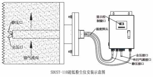 SVPT-100型煙氣"S"皮托管流速儀是基于傳統皮托管的差壓測量原理設計的。采用"S"型皮托管檢測頭,測量時 將皮托管探頭插入管道中,并使探頭中心軸線處于過流斷面中心且與流線方向一致,探頭全壓測孔正 對來流,靜壓測孔背對來流,分別將全壓靜壓傳遞給傳感器,傳感器測得差壓值即動壓。此動壓值與 煙氣流速有關,流速大則動壓大,無流速時動壓為零。從而根據計算公式由動壓、煙氣氣體常數、煙 氣溫度、皮托管修正系數等計算出流速數值。其中皮托管修正系數由風洞試驗測量得出。