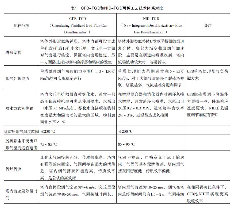 煙氣循環(huán)流化床CFB-FGD、 NID-FGD兩種半干法脫硫除塵治理工藝技術(shù)體系對(duì)比見表1。