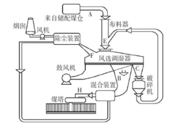風(fēng)動選擇煤調(diào)濕工藝特點(diǎn):該裝置位于備煤車間粉碎機(jī)前,具備風(fēng)選功能,<3mm的煤料直接送往煤塔,其中的大顆粒、重質(zhì)顆粒進(jìn)入粉碎機(jī)進(jìn)行粉碎,粉碎后的煤再進(jìn)行風(fēng)選,形成閉路循環(huán),裝爐煤中不存在大顆粒、重質(zhì)顆粒,水分降至6%~7%,不僅實(shí)現(xiàn)了入爐煤的風(fēng)動選擇粉碎,而且實(shí)現(xiàn)了對入爐煤水分的調(diào)濕;布袋除塵器濾出的煤粉,壓成型煤入爐煉焦。