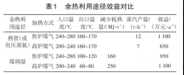 由于焦?fàn)t加熱用煤氣種類的不同,焦?fàn)t煙道廢氣余熱利用的溫度差別很大,以年產(chǎn)120萬t焦炭的焦?fàn)t煙道廢氣利用熱管技術(shù)生產(chǎn)蒸汽(或負(fù)壓蒸氨)和煤調(diào)濕技術(shù)進(jìn)行對比,對比結(jié)果見表1。